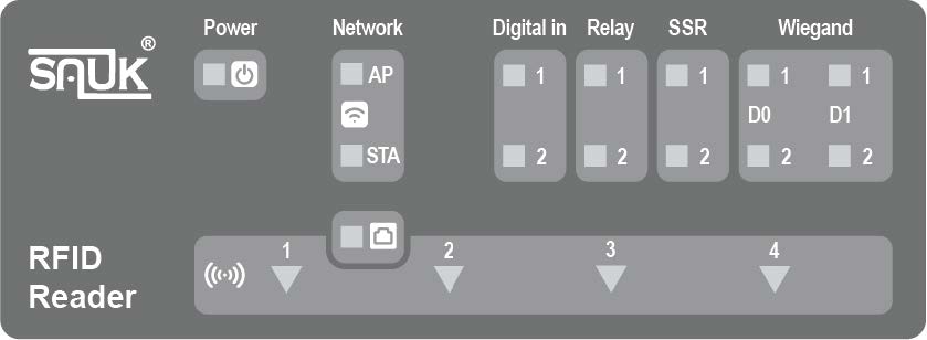 Внешний вид интерфейсов RFID-считывателя SAUK E4 представлен на картинках ниже.