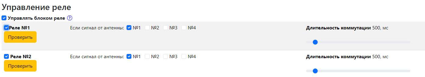 Если метка, которая попала в зону действия RFID-считывателя, соответствует критериям "Свой\чужой" (прошла проверку по фильтру, по RSSI, по таблице доступа, по паролю), и если стоит галочка, разрешающая работу соответствующего реле от соответствующей антенны, то реле замкнется на время "Длительность коммутации". Например, на картинке ниже (рисунок 10) — реле 1 и реле 2 замкнутся при попадании метки в зону действия антенны №1. При этом реле от сигналов антенн №: 2, 3 и 4 не сработают вообще.